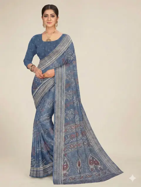 Blue Printed Georgette Saree with Traditional Border – Lightweight & Elegant