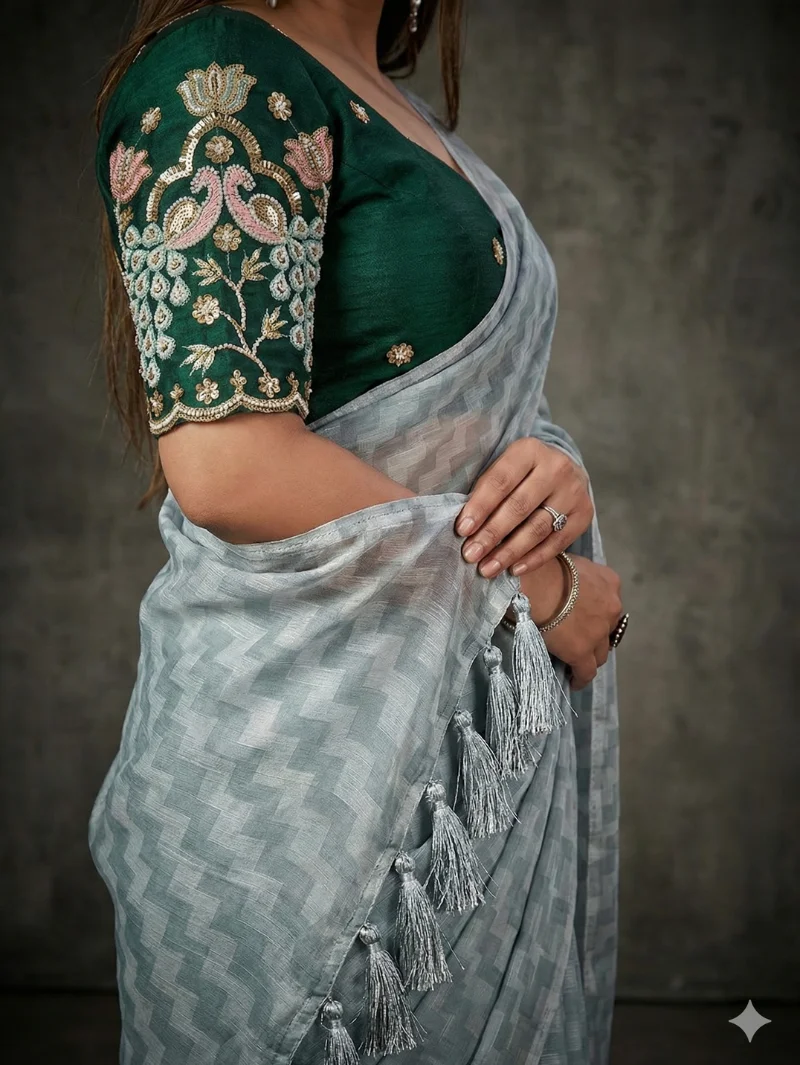 The delicate textured finish adds depth and richness to the overall design, allowing the saree to look both minimal and luxurious. Paired with a beautifully embroidered designer blouse, this ensemble strikes the perfect balance between contemporary styling and traditional appeal.