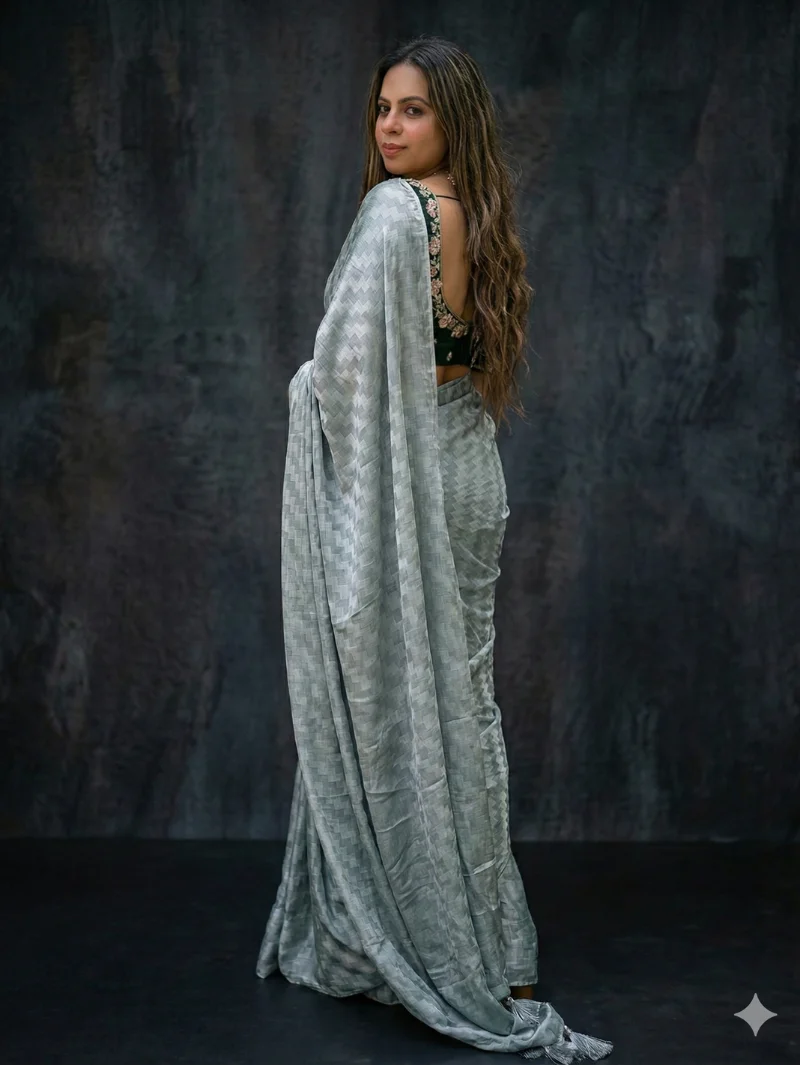 The subtle silver grey shade exudes timeless charm, making it a versatile addition to your wardrobe. Perfectly suited for festive occasions, parties, evening gatherings, and special celebrations, this saree creates an elegant statement without appearing overpowering.